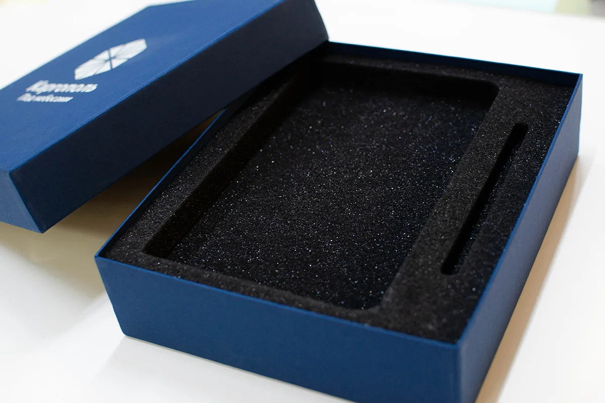 - Солидный вид: Жесткая конструкция упаковки визуально повышает ценность содержимого. Это не просто сувенирная продукция, а серьезный деловой презент.