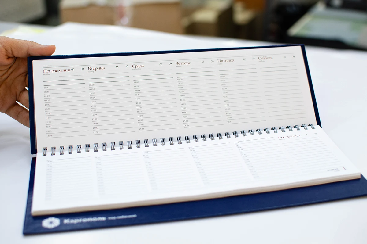 - На обложку ежедневника: Логотип, слоган или контакты компании будут всегда перед глазами у владельца.