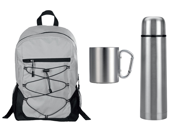 Набор туриста с термосом и кружкой в рюкзаке